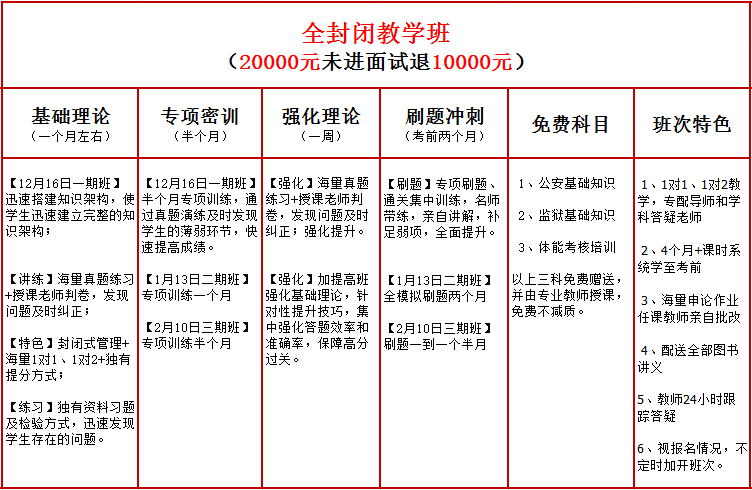 全年班(整年學(xué)習(xí)),學(xué)習(xí)3次課。所有教案,卷子,題庫都免費(fèi)發(fā)放。大概1000元的資料大放送,公安基礎(chǔ)監(jiān)獄基礎(chǔ)免費(fèi)!